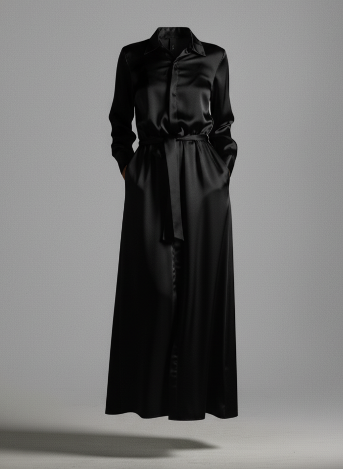 * Simple elegance redefined with this expertly designed A-lined maxi dress. *SIlk covered front button closure, shirt collar and buttoned cuffs, removable silk belt. * French-seams. * Unlined.